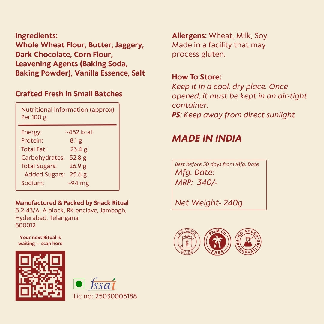 Classic chocolate chip — but cleaner. Made with whole wheat flour, jaggery instead of refined sugar, no palm oil, no preservatives.
